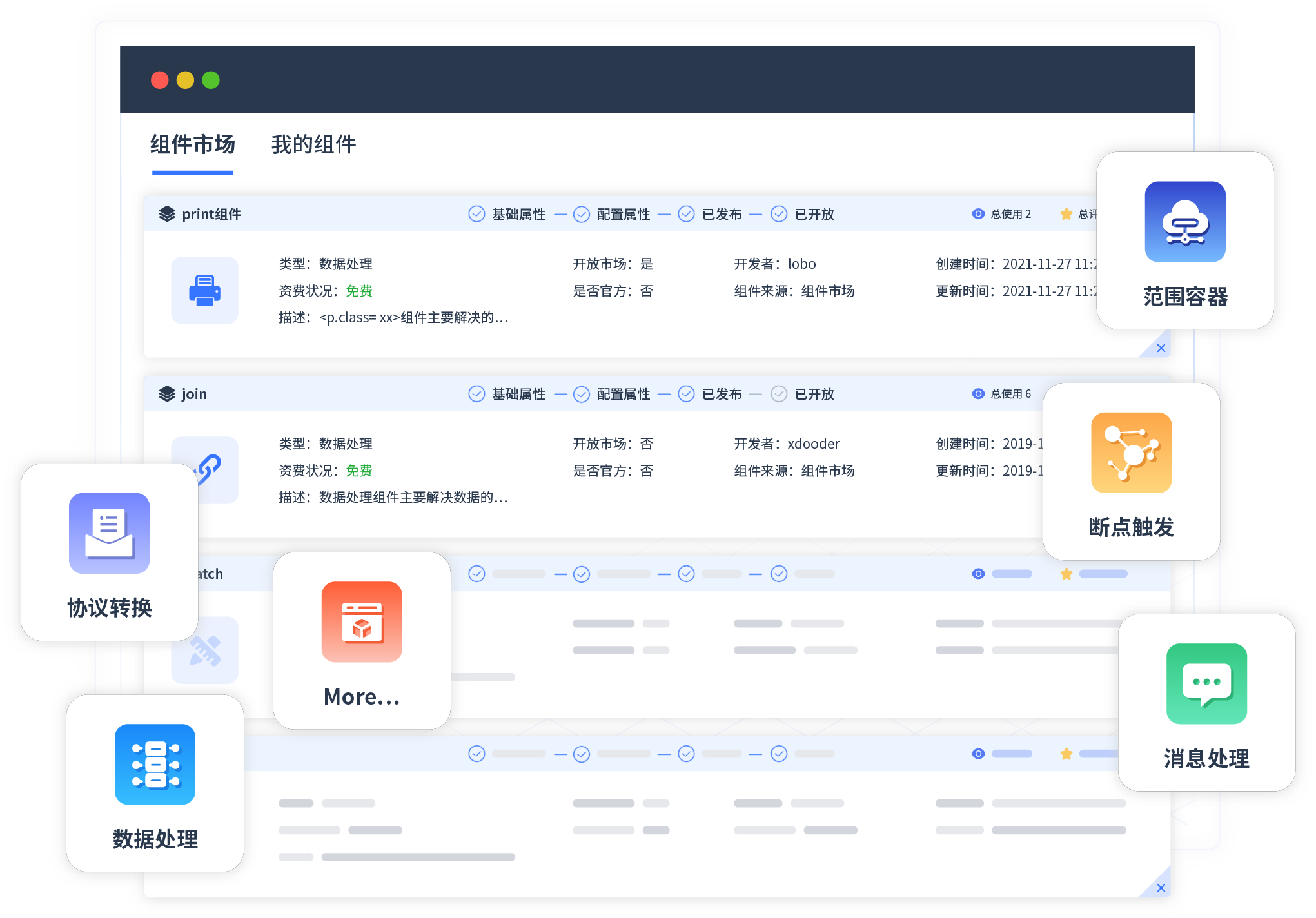 针对集成场景,pg国际提供组件市场,例如协议转换、消息处理、文件操作等。除平台提供的组件外,客户可以自定义所需组件。